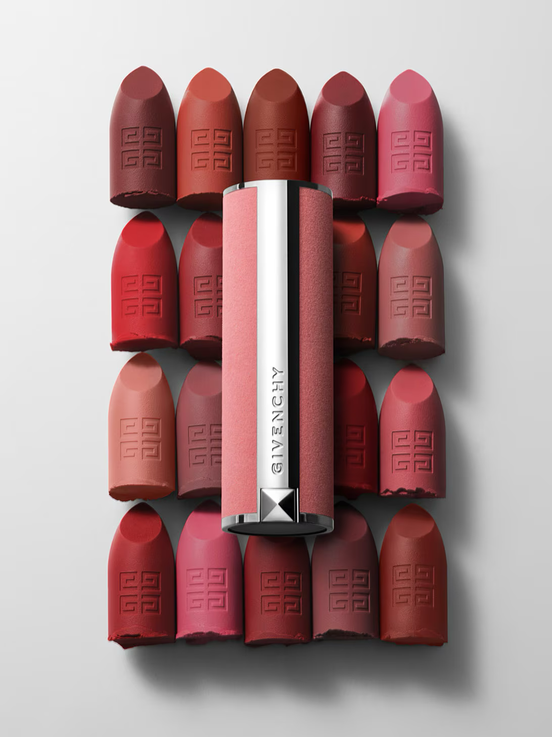 Dressed in a sensorial rosewood velvet case echoing its powdery matte finish, and compete with the Givenchy logo and 4G emblem, Le Rouge Sheer Velvet embodies the Maison's iconic aesthetic to create a precious fashion accessory.